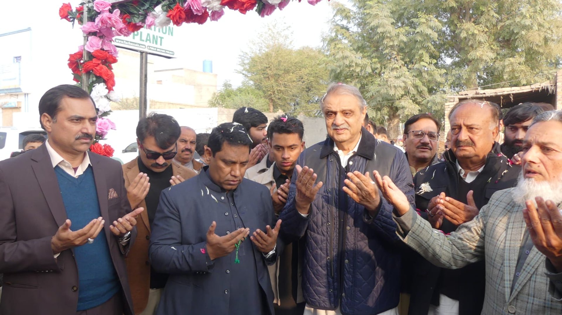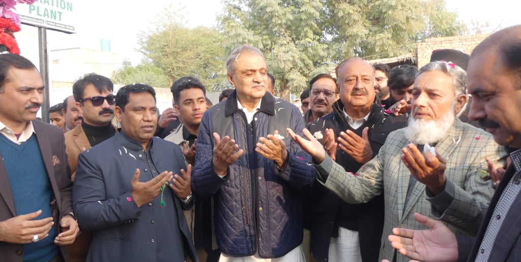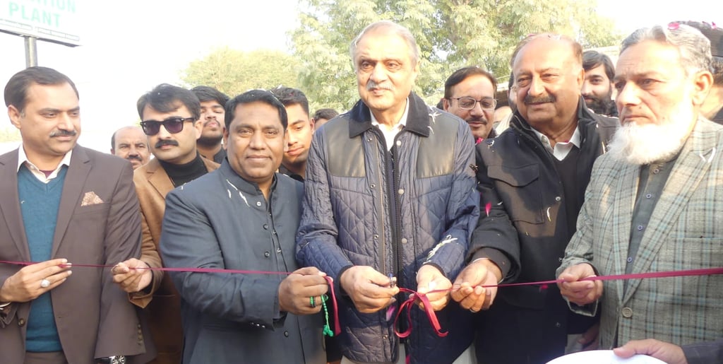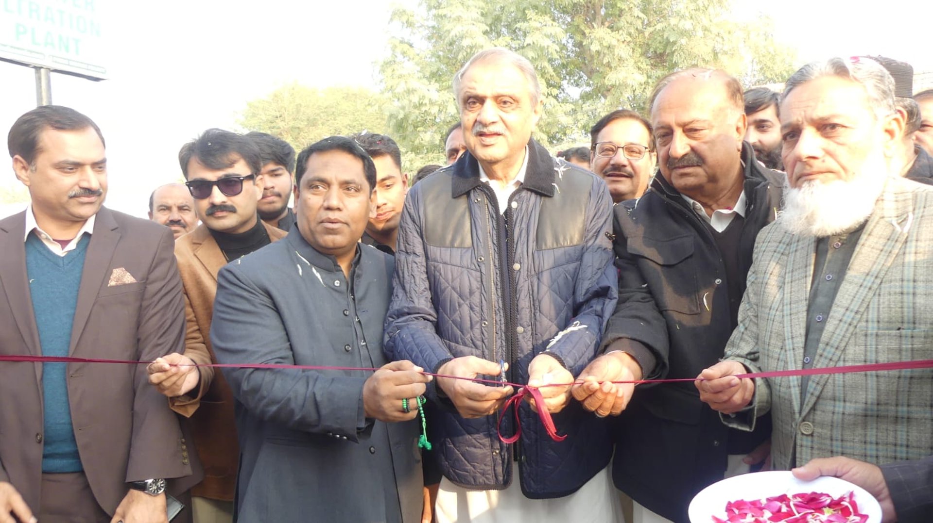A group of respected community leaders, organizers, and local representatives can be seen gathered at the facility, marking the launch of this vital project. The presence of attendees and media highlights the importance of access to purified water and the collective effort behind making this initiative possible.